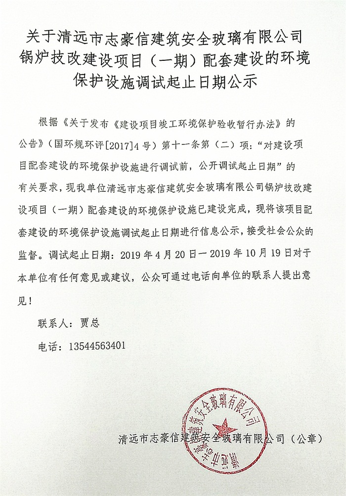 關(guān)于清遠(yuǎn)市志豪信建筑安全玻璃有限公司鍋爐技改建設(shè)項目(一期)配套建設(shè)的環(huán)境保護(hù)設(shè)施調(diào)試起止日期公示