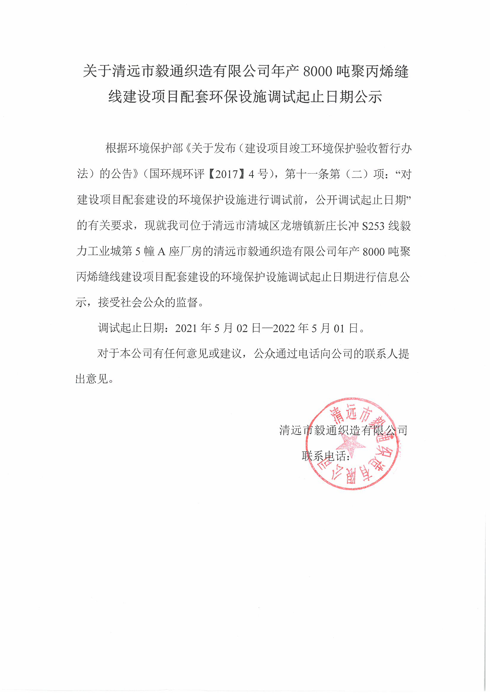 關(guān)于清遠(yuǎn)市毅通織造有限公司年產(chǎn)8000噸聚丙烯縫線建設(shè)項(xiàng)目配套環(huán)保設(shè)施調(diào)試起止日期的公示